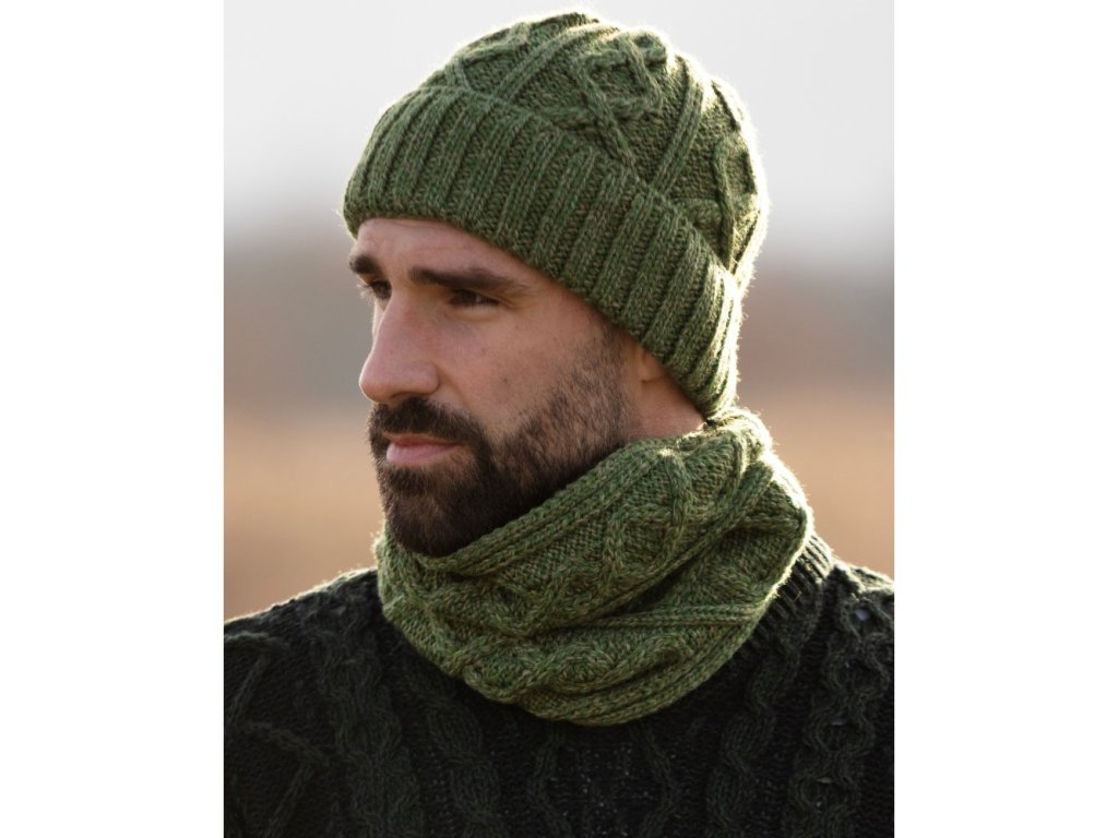 Přirozená krása Aran Knitwear může být potvrzena pozorností k detailu ve šití. Každý vzor nese symboliku, která spojuje pleteninu s dědictvím a historií Aranských ostrovů. Náš Harwell Snood má „Diamantový steh“. Tento vzor symbolizuje tvary používaných rybářských sítí ostrovanů. Protože tato rybářská oka sloužila k obživě – to znamená bohatství a úspěch.