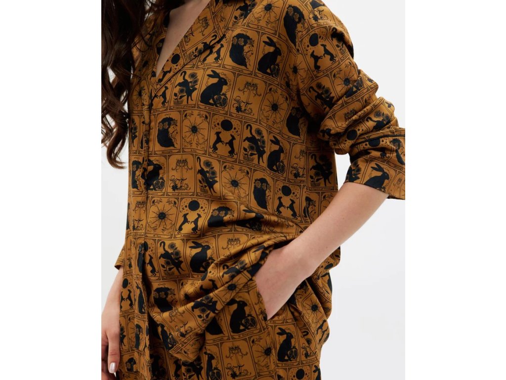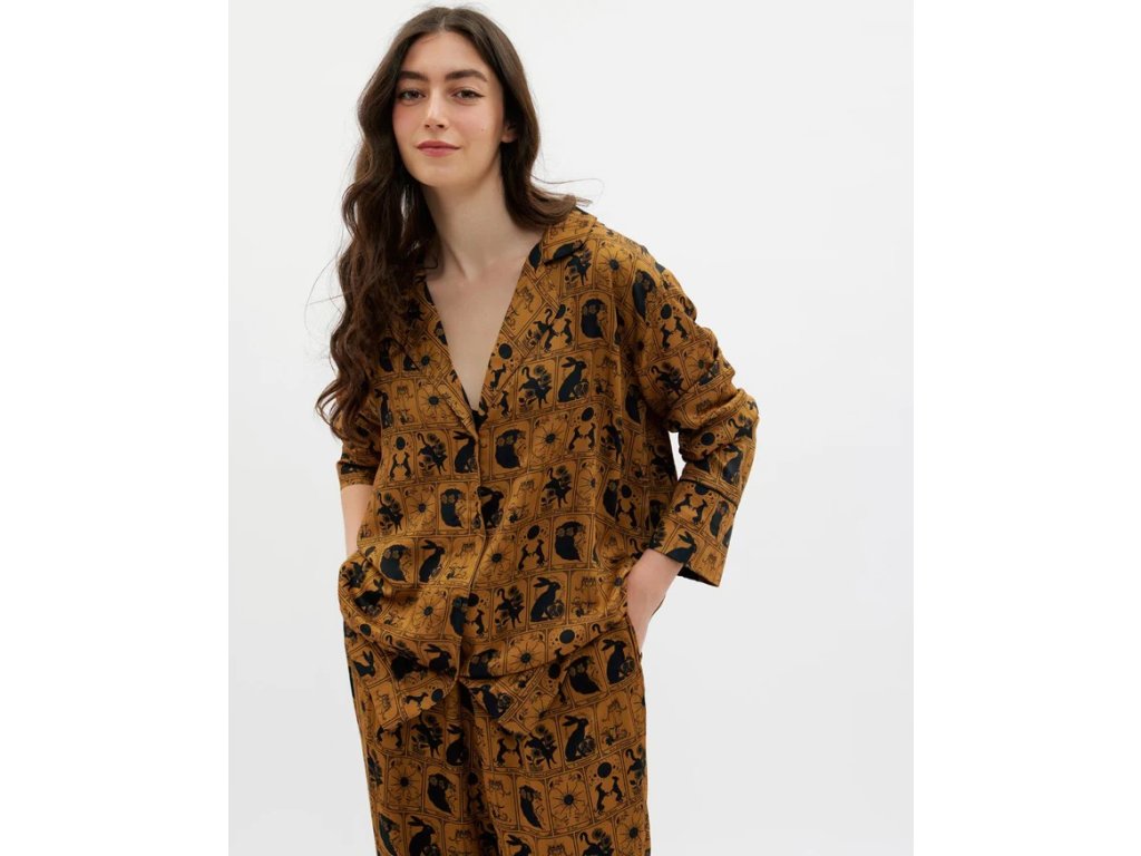 Náš klasicky ušitý dlouhý pyžamový set zajišťuje maximální pohodlí a eleganci, navržený ve spolupráci s naší speciální hostující umělkyní, Jessicou Roux, s naším potiskem Tarot Tales. Odborně vyrobené z prémiového viskózového saténu, nádherně měkké a zdobené zlatým lemováním pro luxusní povrch. Potisk kombinuje moudrost tarotových karet s okouzlením flóry a fauny a vytváří tak jedinečnou směs magie a pohodlí. Tato pyžama slibují klidný spánek a stylové probuzení.
