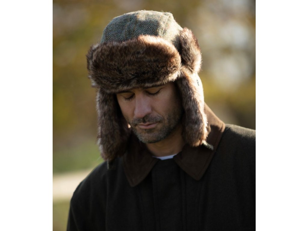 Klasická traperská ušanka s prémiovou úpravou Harris Tweed. Vnější plášť je vyroben ze slavné 100% ručně vyráběné panenské vlny v kombinaci s hřejivým a luxusním pocitem vnitřní umělé kožešiny – náš klobouk Charles Trapper Hat ochrání vaši hlavu před nejchladnějším větrem.