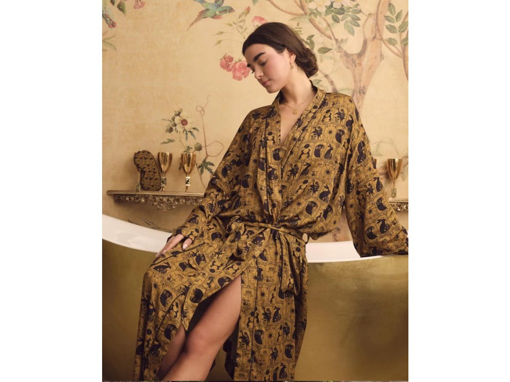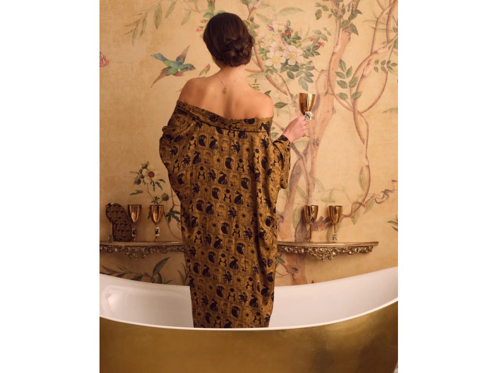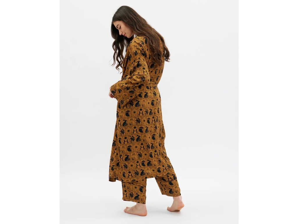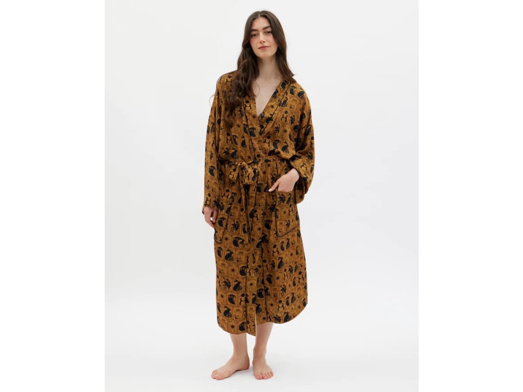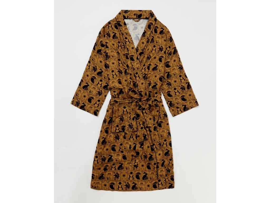 Uchovejte si v pohodlí a eleganci naše tarotové kimono, nebeské mistrovské dílo navržené ve spolupráci s naší speciální hostující umělkyní Jessicou Roux. Toto celovečerní kimono spřádá příběhy o magii a mystice a obsahuje náš potisk Tarotových příběhů, který kombinuje moudrost tarotových karet s okouzlením flóry a fauny. Toto kimono, vyrobené z prémiového viskózového saténu a zdobené zlatým saténovým lemováním, slibuje nadčasovou eleganci a dotek kouzla Fable.